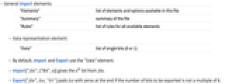 "Elements" list of elements and options available in this file "Summary" summary of the file "Rules" list of rules for all available elements - Data representation element: