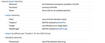 "Elements" list of elements and options available in this file "Summary" summary of the file "Rules" list of rules for all available elements - Import elements: