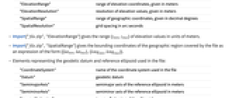 "Dimensions" size of the elevation data array "ElevationRange" range of elevation coordinates, given in meters "ElevationResolution" resolution of elevation values, given in meters "SpatialRange" range of geographic coordinates, given in decimal degrees "SpatialResolution" grid spacing in arc seconds - Import["file.zip","ElevationRange"] gives the range {zmin,zmax} of elevation values in units of meters.