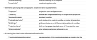 "Projection" projection name and parameters "Centering" latitude and longitude defining the origin of the projection "StandardParallels" standard parallels "CentralScaleFactor" scale factor at the central meridian or center of projection "GridOrigin" grid coordinates {n,e} of the central parallel and meridian "ProjectionName" Wolfram Language standard name of the projection used "ReferenceModel" what reference sphere or ellipsoid to use - Accessing low-level meta-information from the file: