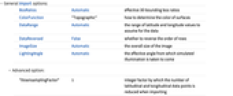 BoxRatios Automatic effective 3D bounding box ratios ColorFunction "Topographic" how to determine the color of surfaces DataRange Automatic the range of latitude and longitude values to assume for the data DataReversed False whether to reverse the order of rows ImageSize Automatic the overall size of the image LightingAngle Automatic the effective angle from which simulated illumination is taken to come - Advanced option: