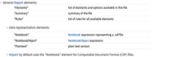 "Notebook" Notebook expression representing a .cdf file "NotebookObject" NotebookObject expression "Plaintext" plain text version - Import by default uses the "Notebook" element for Computable Document Format (CDF) files.