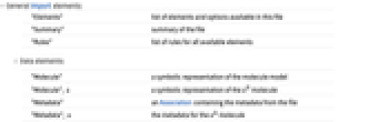 "Elements" list of elements and options available in this file "Summary" summary of the file "Rules" list of rules for all available elements - Data elements: