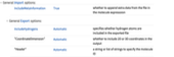 IncludeHydrogens Automatic specifies whether hydrogen atoms are included in the exported file "CoordinateDimension" Automatic whether to include 2D or 3D coordinates in the output "Header" Automatic a string or list of strings to specify the molecule ID