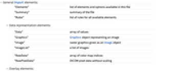 "Elements" list of elements and options available in this file "Summary" summary of the file "Rules" list of rules for all available elements - Data representation elements: