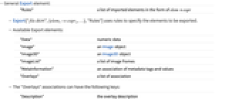 "Data" numeric data "Image" an Image object "Image3D" an Image3D object "ImageList" a list of image frames "MetaInformation" an association of metadata tags and values "Overlays" a list of association - The "Overlays" associations can have the following keys:
