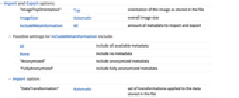 "ImageTopOrientation" Top orientation of the image as stored in the file ImageSize Automatic overall image size IncludeMetaInformation All amount of metadata to import and export - Possible settings for IncludeMetaInformation include: