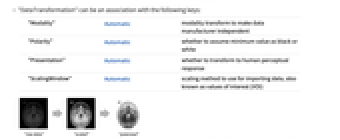 "Modality" Automatic modality transform to make data manufacturer independent "Polarity" Automatic whether to assume minimum value as black or white "Presentation" Automatic whether to transform to human perceptual response "ScalingWindow" Automatic scaling method to use for importing data, also known as values of interest (VOI) - By default, the modality transformation specified in the file is used. Use "Modality"None to disable this transform.