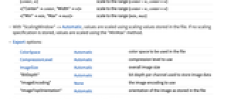 ColorSpace Automatic color space to be used in the file CompressionLevel Automatic compression level to use ImageSize Automatic overall image size "BitDepth" Automatic bit depth per channel used to store image data "ImageEncoding" None the image encoding to use "ImageTopOrientation" Automatic orientation of the image as stored in the file - Supported ColorSpace settings are "Grayscale" and "RGB".