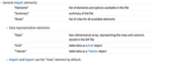 "Elements" list of elements and options available in this file "Summary" summary of the file "Rules" list of rules for all available elements - Data representation elements: