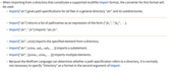 - Import["dir","subdir/*.jpg"] imports all JPEG files from "dir/subdir".