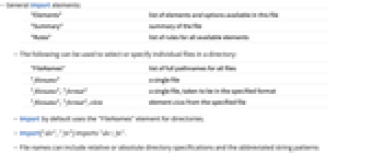 "Elements" list of elements and options available in this file "Summary" summary of the file "Rules" list of rules for all available elements - The following can be used to select or specify individual files in a directory: