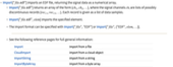 - The import format can be specified with Import["file","EDF"] or Import["file",{"EDF",elem,…}].