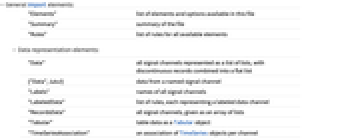 "Elements" list of elements and options available in this file "Summary" summary of the file "Rules" list of rules for all available elements - Data representation elements: