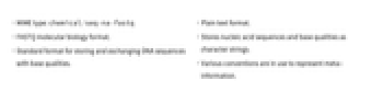 - Standard format for storing and exchanging DNA sequences with base qualities.