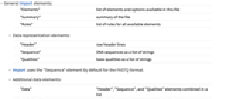 - The import format can be specified with Import["file","FASTQ"] or Import["file",{"FASTQ",elem,…}].