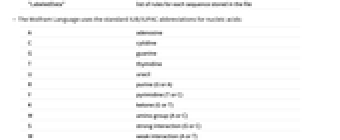 "Data" "Header", "Sequence", and "Qualities" elements combined in a list "LabeledData" list of rules for each sequence stored in the file - The Wolfram Language uses the standard IUB/IUPAC abbreviations for nucleic acids: