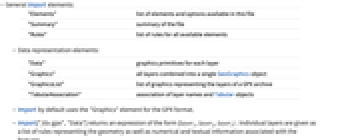 "Elements" list of elements and options available in this file "Summary" summary of the file "Rules" list of rules for all available elements - Data representation elements: