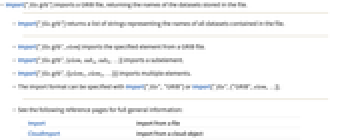 - Import["file.grb"] returns a list of strings representing the names of all datasets contained in the file.