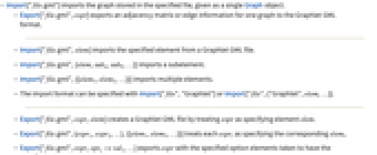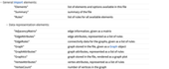 "AdjacencyMatrix" edge information, given as a matrix "EdgeAttributes" edge attributes, represented as a list of rules "EdgeRules" connectivity data for the graphs, given as a list of rules "Graph" graph stored in the file, given as a Graph object "GraphAttributes" graph attributes, represented as a list of rules "Graphics" graph stored in the file, rendered as a graph plot "VertexAttributes" vertex attributes, represented as a list of rules "VertexCount" number of vertices in the graph "VertexList" vertices, given as a list of strings - Import by default uses the "Graph" element when importing from Graphlet GML.