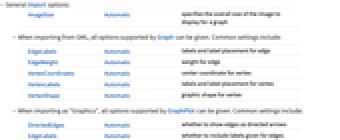 EdgeLabels Automatic labels and label placement for edge EdgeWeight Automatic weight for edge VertexCoordinates Automatic center coordinate for vertex VertexLabels Automatic labels and label placement for vertex VertexShape Automatic graphic shape for vertex - When importing as "Graphics", all options supported by GraphPlot can be given. Common settings include: