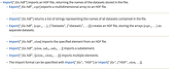 - Import["file.hdf",{{elem1,elem2,…}}] imports multiple elements.