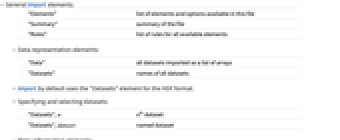 "Elements" list of elements and options available in this file "Summary" summary of the file "Rules" list of rules for all available elements - Data representation elements:
