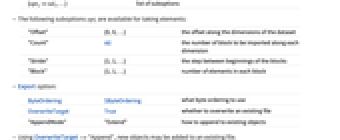"Offset" {0,0,…} the offset along the dimensions of the dataset "Count" All the number of block to be imported along each dimension "Stride" {1,1,…} the step between beginnings of the blocks "Block" {1,1,…} number of elements in each block - Export option: