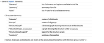 "Datasets" names of all datasets "Groups" names of all groups "StructureGraph" a directed graph showing the structure of the datasets {"StructureGraph, groupname} a graph showing the structure under groupname "StructureGraphLegend" legend for the structure graph "Summary" summary of properties - Names of groups and datasets are given as the absolute paths starting with the root group name "/".