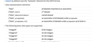 dataset{"Data",dataset} or dataset named dataset {"Data",groupname} an association of all datasets under groupname {"Data",groupname,lev} an association of datasets under groupname up to level lev - The following basic data types are supported: