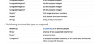 "Integer8" 8-bit integers "Integer16" 16-bit integers "Integer32" 32-bit integers "Integer64" 64-bit integers "UnsignedInteger8" 8-bit unsigned integers "UnsignedInteger16" 16-bit unsigned integers "UnsignedInteger32" 32-bit unsigned integers "UnsignedInteger64" 64-bit unsigned integers "Real32" IEEE single‐precision numbers "Real64" IEEE double‐precision numbers "String" string of ASCII characters - The following structured data types are supported: