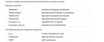 "Attributes" attributes of all groups and datasets "DataEncoding" specifies how each dataset is compressed "DataFormat" type used to represent each dataset "Dimensions" data dimensions of each dataset {"metadata",n} metadata of the n