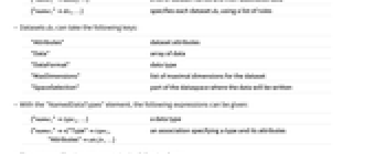 "Attributes" dataset attributes "Data" array of data "DataFormat" data type "MaxDimensions" list of maximal dimensions for the dataset "SpaceSelection" part of the dataspace where the data will be written - With the "NamedDataTypes" element, the following expressions can be given: