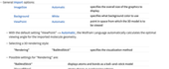 ImageSize Automatic specifies the overall size of the graphics to display Background White specifies what background color to use ViewPoint Automatic point in space from which the 3D model is to be viewed - With the default setting "ViewPoint"->Automatic, the Wolfram Language automatically calculates the optimal viewing angle for the imported molecule geometry.
