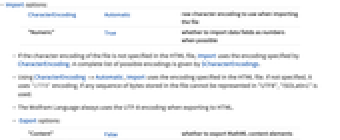 CharacterEncoding Automatic raw character encoding to use when importing the file "Numeric" True whether to import data fields as numbers when possible - If the character encoding of the file is not specified in the HTML file, Import uses the encoding specified by CharacterEncoding. A complete list of possible encodings is given by $CharacterEncodings.