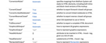 "Content" False whether to export MathML content elements "ConversionRules" Automatic specifies mappings from Wolfram System cell styles to HTML elements, including both inline and block-level versions of the markup "ConvertClosed" True whether to export forward-closed cell groups "ConvertLinkedNotebooks" False whether to convert linked notebooks to HTML "ConvertReverseClosed" False whether to export reverse-closed cell groups "CSS" Automatic what CSS stylesheet to use or link to "FullDocument" True whether to export a complete HTML document "Graphics3DOutput" Automatic how to represent 3D graphics expressions "GraphicsOutput" "GIF" how to represent graphics expressions "HeadAttributes" {} attributes to be inserted in HTML <head> tag, given as a list of rules "HeadElements" {} subelements of HTML <head> tag "ManipulateOutput" "CDF" how to represent Manipulate expressions "MathOutput" "GIF" how to represent typeset expressions - Possible settings for "GraphicsOutput", "Graphics3DOutput", "ManipulateOutput", and "MathOutput" are:
