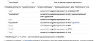 - The choice of option to use for output conversion is based upon the type of the object at the top level of the cell. For example, a cell that contains only a 2D graphic will use "GraphicsOutput", while a cell that contains a 2D graphic embedded in typesetting or code will use "MathOutput".