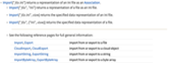 Import, Export import from or export to a file CloudImport, CloudExport import from or export to a cloud object ImportString, ExportString import from or export to a string ImportByteArray, ExportByteArray import from or export to a byte array