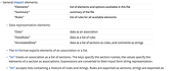 "Elements" list of elements and options available in this file "Summary" summary of the file "Rules" list of rules for all available elements - Data representation elements: