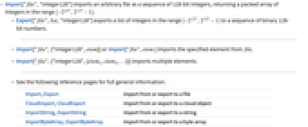 - Import["file","Integer128"] imports an arbitrary file as a sequence of 128-bit integers, returning a packed array of integers in the range