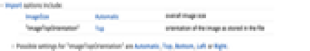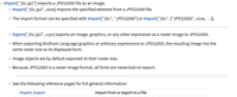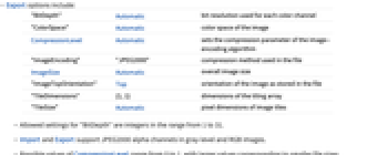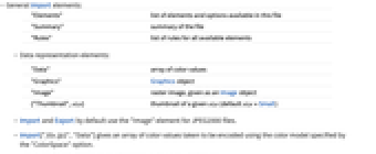 "Data" array of color values "Graphics" Graphics object "Image" raster image, given as an Image object {"Thumbnail",size} thumbnail of a given size (default size = Small) - Import and Export by default use the "Image" element for JPEG2000 files.