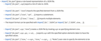 - Export["file.json",{"elem1"->expr1,"elem2"->expr2,…},"Rules"] uses rules to specify the elements to be exported.
