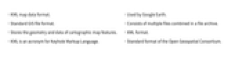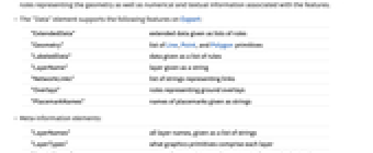 "ExtendedData" extended data given as lists of rules "Geometry" list of Line, Point, and Polygon primitives "LabeledData" data given as a list of rules "LayerName" layer given as a string "NetworkLinks" list of strings representing links "Overlays" rules representing ground overlays "PlacemarkNames" names of placemarks given as strings - Meta-information elements: