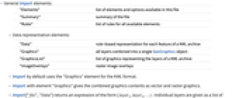 "Elements" list of elements and options available in this file "Summary" summary of the file "Rules" list of rules for all available elements - Data representation elements:
