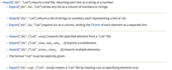 - Export["file",expr, {"List",elem}] creates a "List" file by treating expr as specifying element elem.