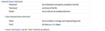 "Elements" list of elements and options available in this file "Summary" summary of the file "Rules" list of rules for all available elements - Data representation elements: