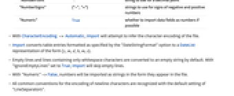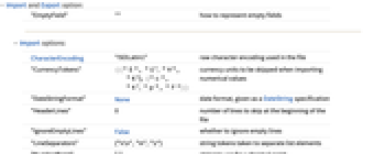 ", "p", "F"}}currency units to be skipped when importing numerical values "DateStringFormat" None date format, given as a DateString specification "HeaderLines" 0 number of lines to skip at the beginning of the file "IgnoreEmptyLines" False whether to ignore empty lines "LineSeparators" {"∖r\n","∖n","\r"} string tokens taken to separate list elements "NumberPoint" "." string to use for a decimal point "NumberSigns" {"-","+"} strings to use for signs of negative and positive numbers "Numeric" True whether to import data fields as numbers if possible - With CharacterEncoding -> Automatic, Import will attempt to infer the character encoding of the file.