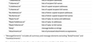 "FromAddress" sender raw email addresses "FromName" sender full names "ToAddressList" lists of recipient addresses "ToNameList" lists of recipient full names "CcAddressList" lists of copied recipient addresses "CcNameList" lists of copied recipient full names "BccAddressList" lists of blind-copied recipient addresses "BccNameList" lists of blind-copied recipient full names "ReplyToList" lists of reply-to names and addresses "ReplyToAddressList" lists of reply-to addresses "ReplyToNameList" lists of reply-to full names "Body" message bodies as strings "AttachmentList" lists of processed attachments as expressions - "MessageElements" includes all summary and message elements excluding "BodyPreview" and "HasAttachments".