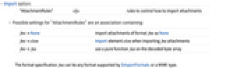"AttachmentRules" <||> rules to control how to import attachments - Possible settings for "AttachmentRules" are an association containing: