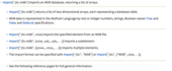 - Import["file.mdb"] imports an MDB database, returning a list of arrays.